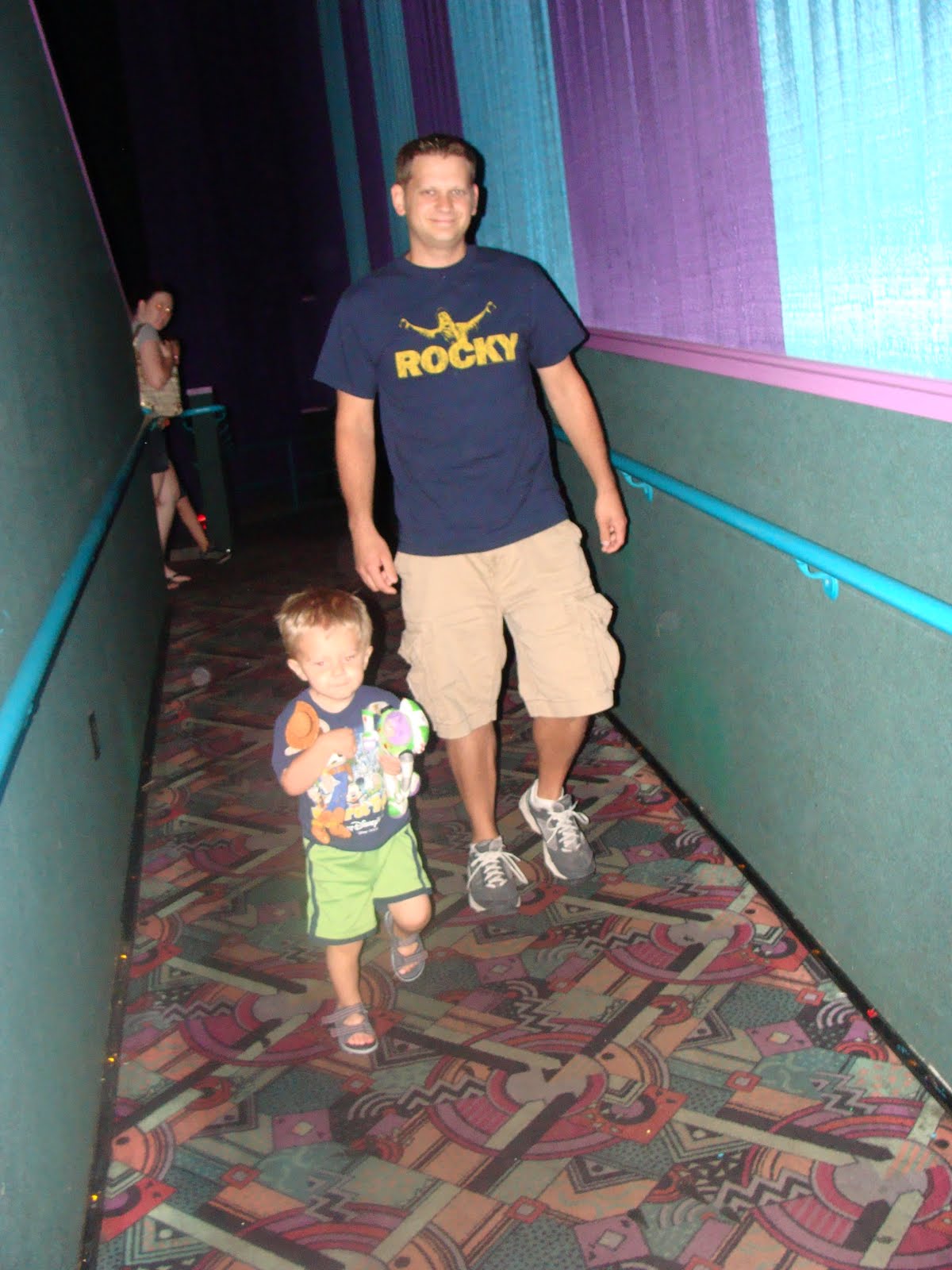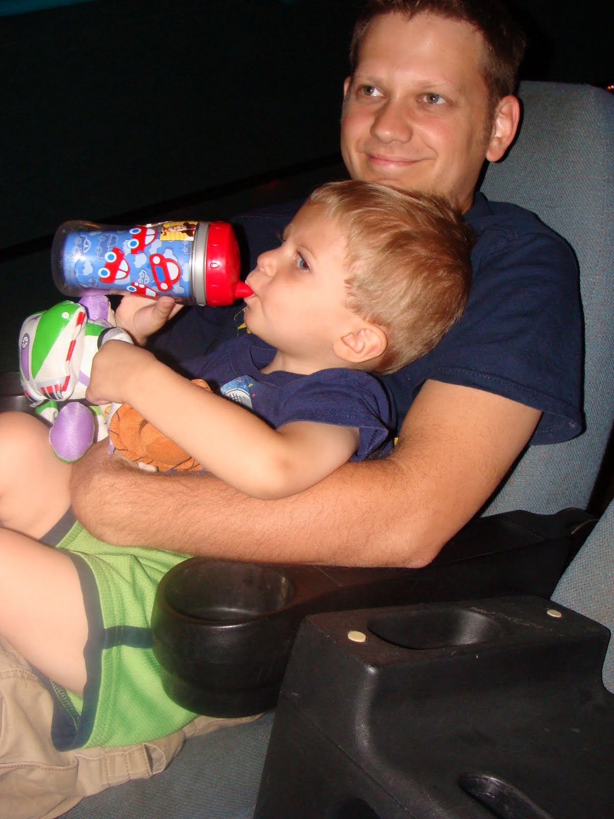 The movie started and from then on Hayden was entranced. He LOVED it. He held on to Buzz and Woody occasionally making Buzz fly and yelling “Buzz! Woody! Jessie!”. He was grinning so much! He sat in his seat the whole time except for the last 20 minutes when he crawled into Heath’s lap.