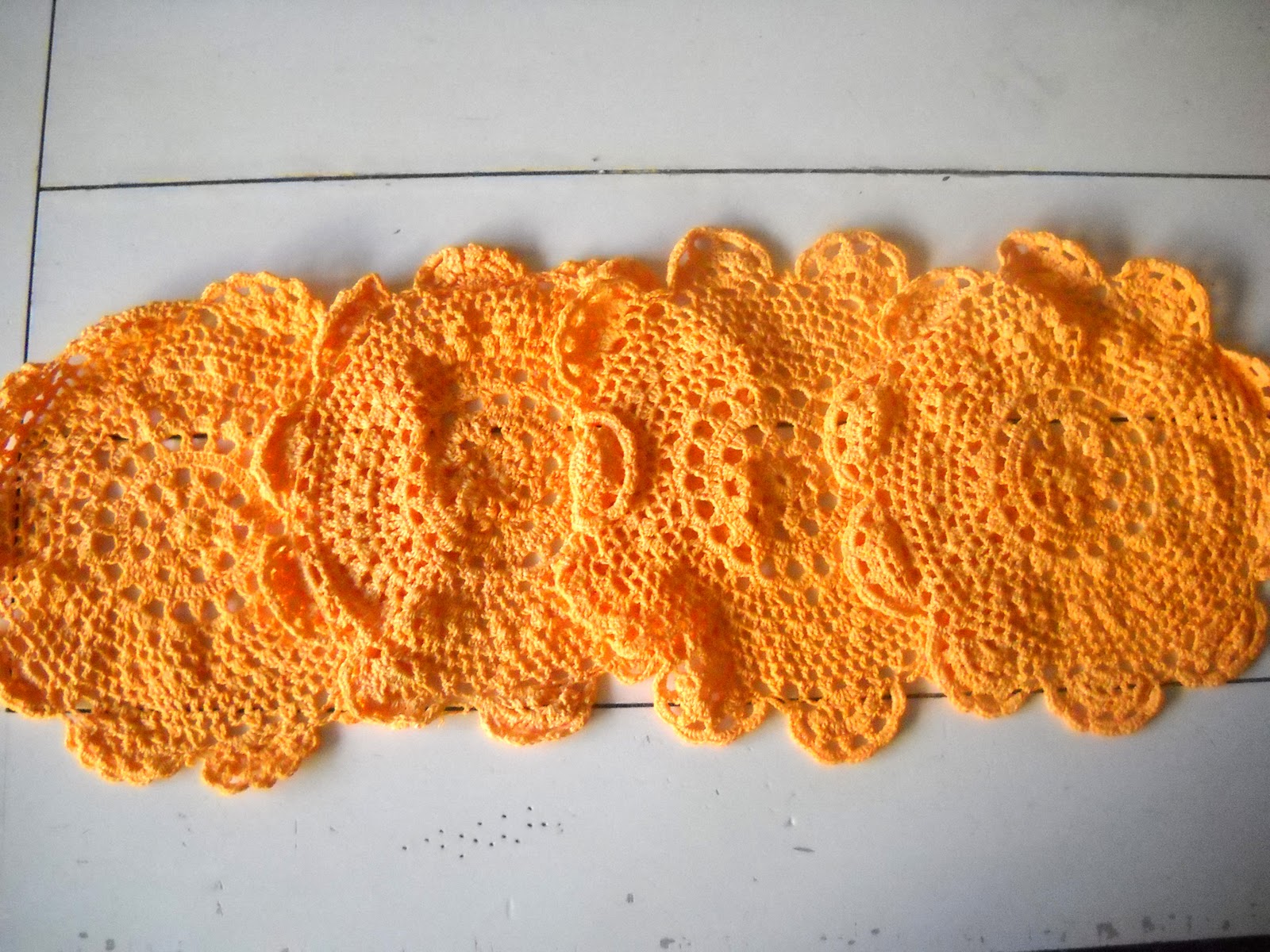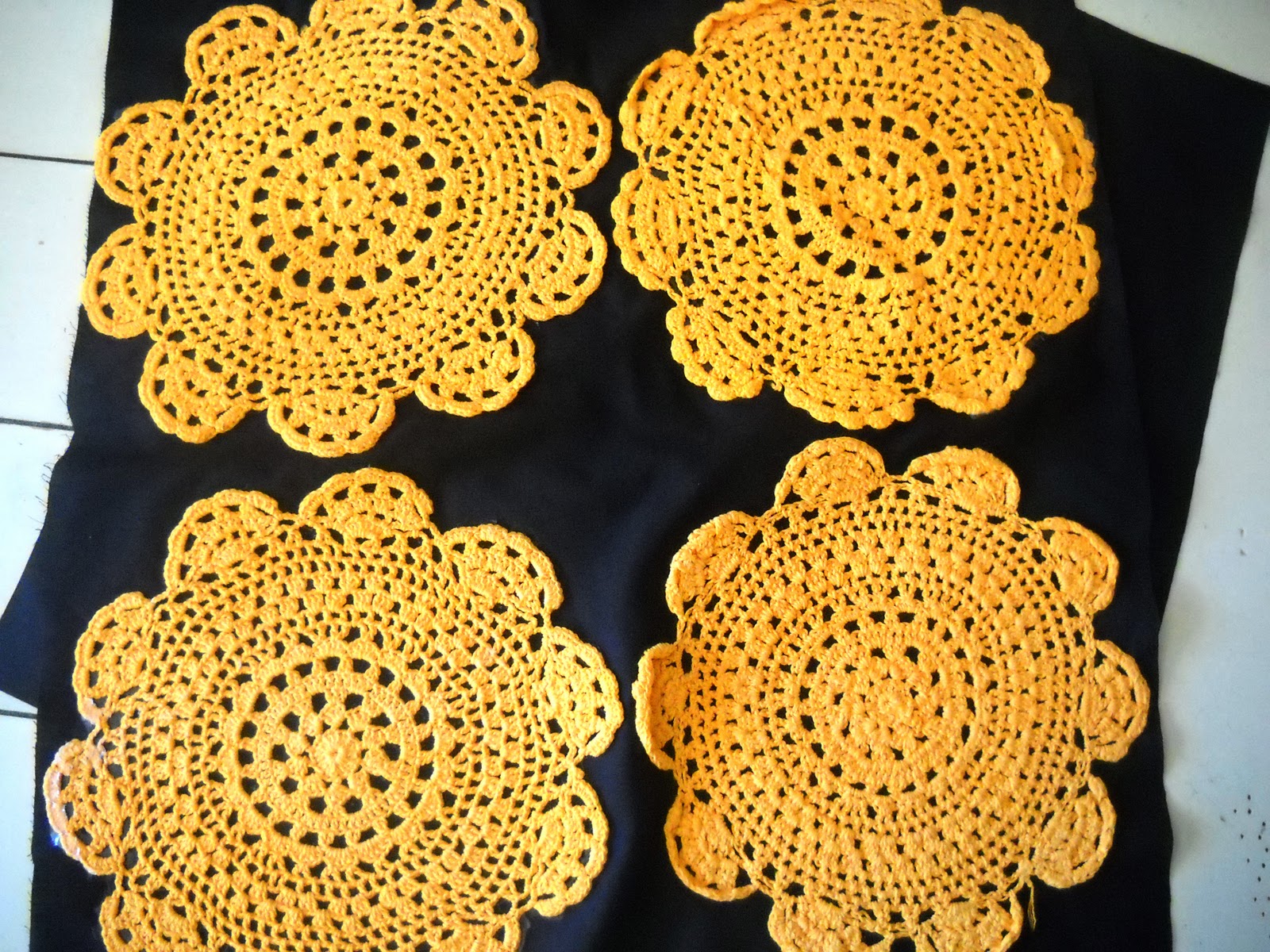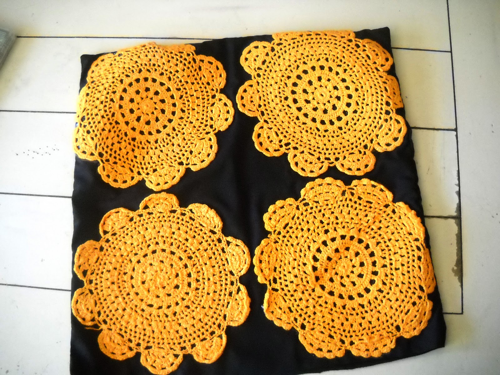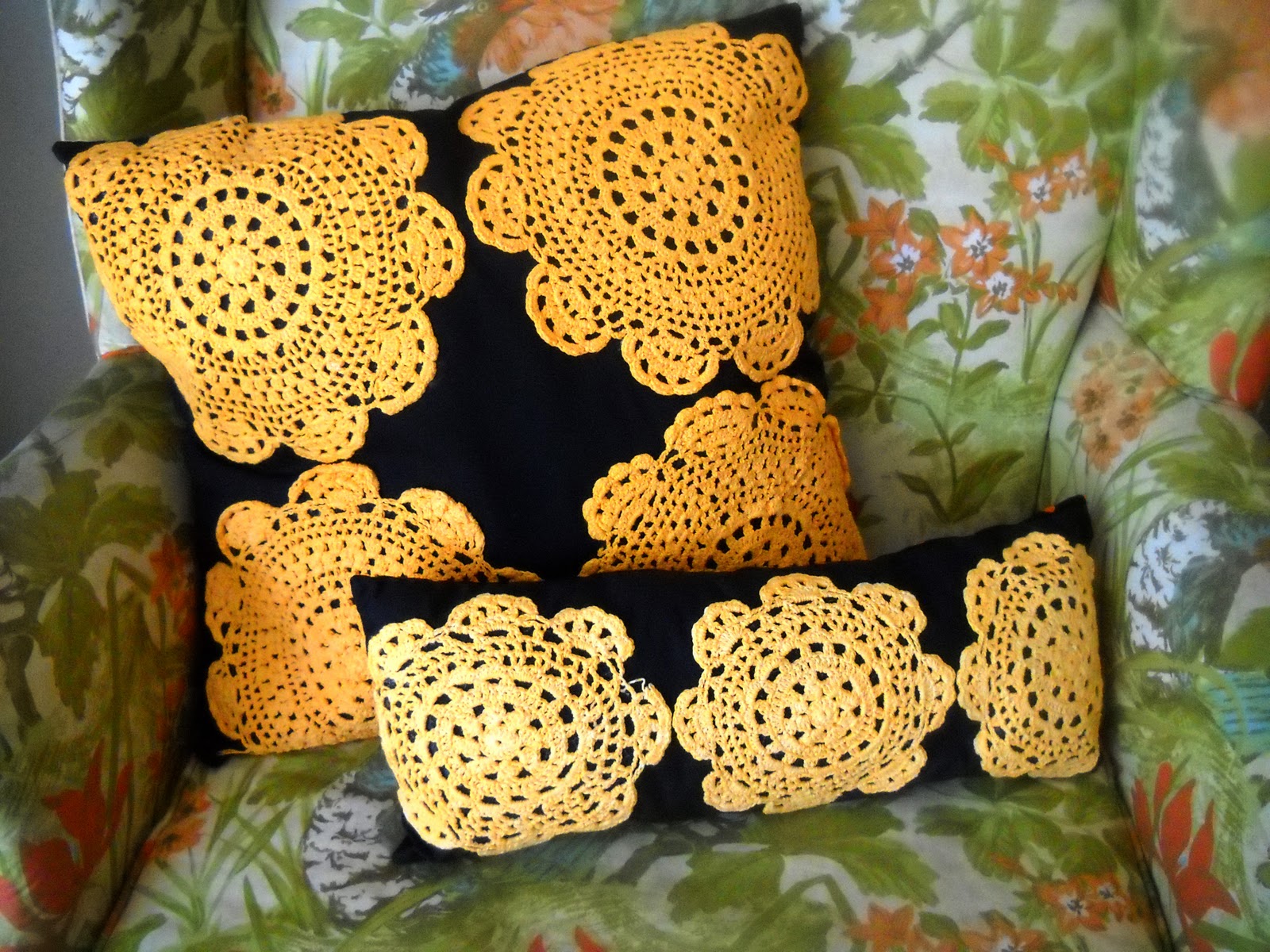 These pillows are so adorable, and I like the black background with the orange doilies. I like the smaller pillow with it also!