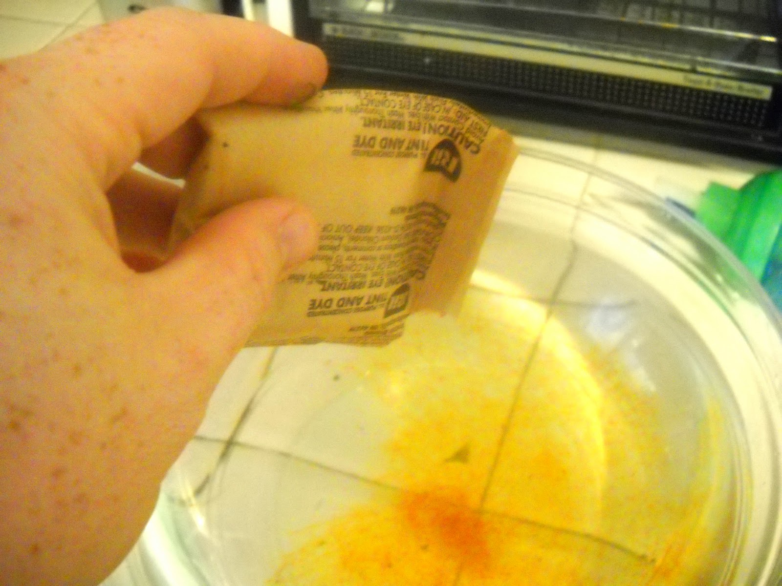 First, fill up a large bowl or container with hot water. Enough water to cover the item(s) you are dying. And add the dye to the bowl. Add as little or as much as you want. Stir the water and dye together making sure that it is all dissolved.