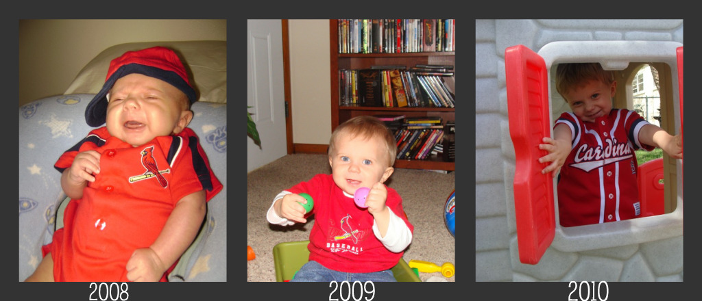 I didn’t intend for this to be a tradition, but it’s turning out to be! Here are some pics of H from the last 3 Cardinals Opening Day. I hope he likes it when he’s in his thirties and I’m getting a picture of him on Opening Day!!