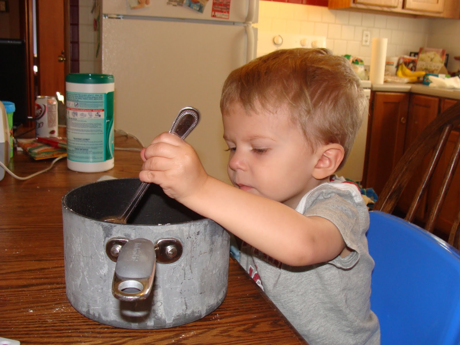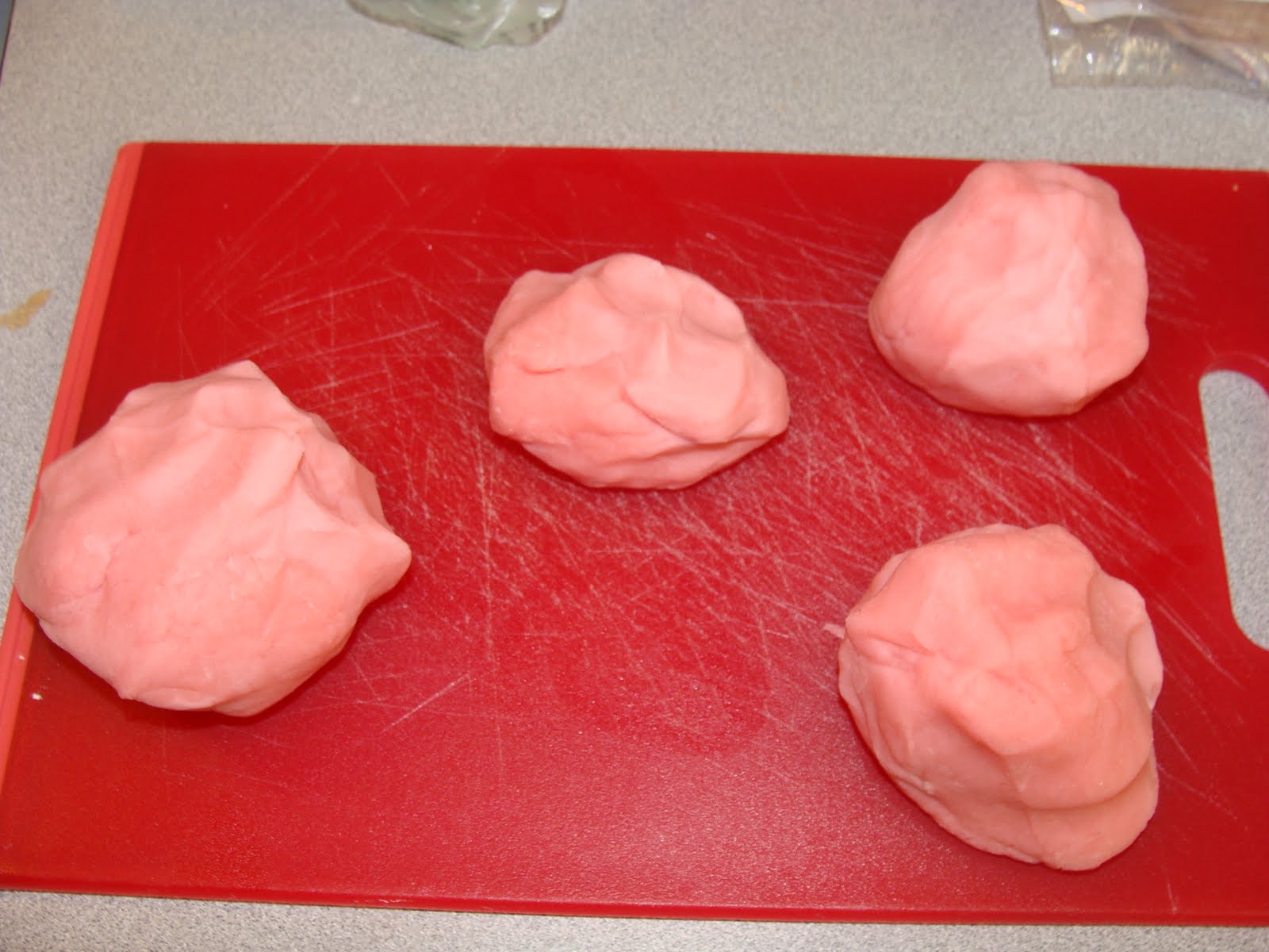 Stir ingredients together. Over medium heat, stir constantly. It will form a ball pretty quickly. Let it cool on the counter or a cutting board and then form into a ball. Cool and store in a covered container. And then play!