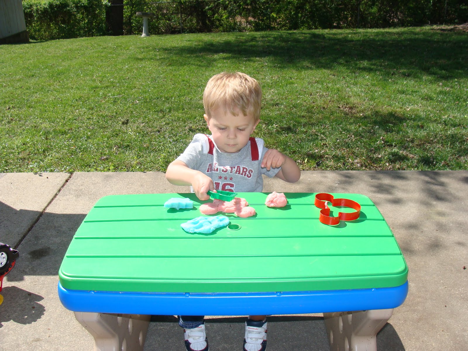 H was a BIG help making the playdough and he loved playing with it. We have taken it out pretty much every day. Oh, and good thing it’s edible because our dog Zoey took a huge bite of it!