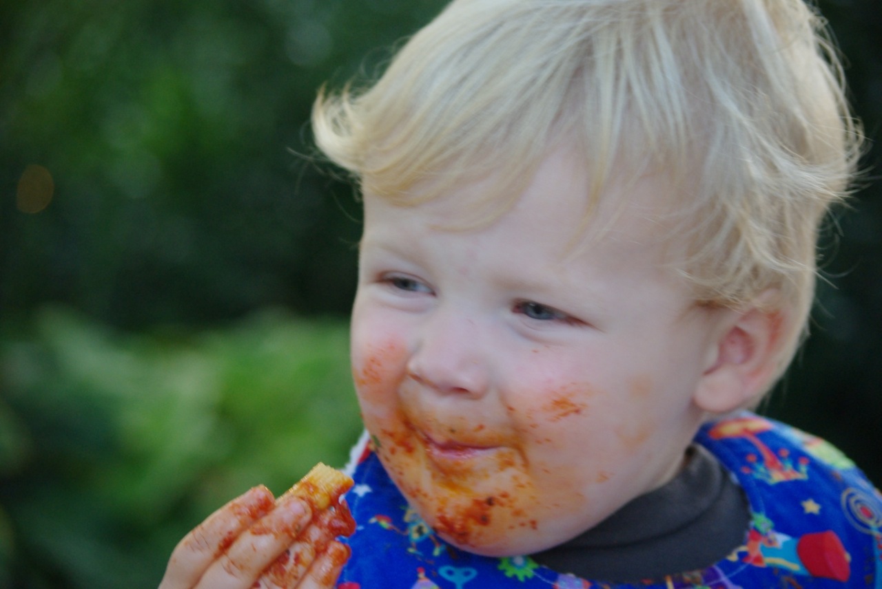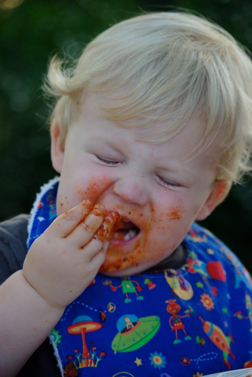 Timmy is…. let’s say intense when it comes to eating. The boy doesn’t mess around. He likes to eat, and anything that gets in the way with that he will take down! I could describe to you how he destroyed his noodles the other night…. but I’ll just let you see for yourself 😉
